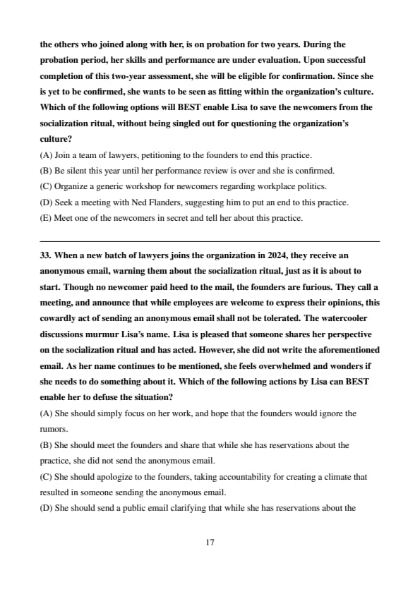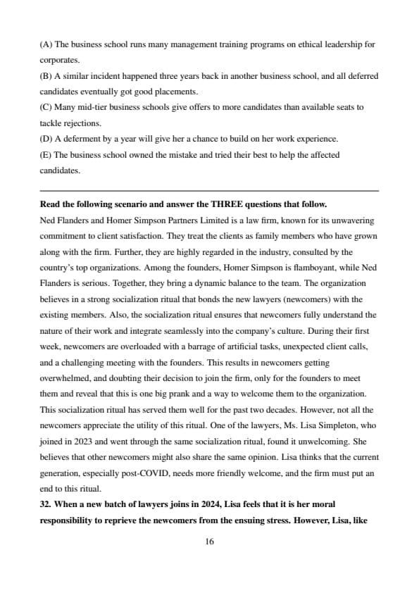 Ned Flanders and Homer Simpson Partners Limited is a law firm, known for its unwavering commitment to client satisfaction. They treat the clients as family members who have grown along with the firm. Further, they are highly regarded in the industry, consulted by the country’s top organizations. Among the founders, Homer Simpson is flamboyant, while Ned Flanders is serious. Together, they bring a dynamic balance to the team. The organization believes in a strong socialization ritual that bonds the new lawyers (newcomers) with the existing members. Also, the socialization ritual ensures that newcomers fully understand the nature of their work and integrate seamlessly into the company’s culture. During their first week, newcomers are overloaded with a barrage of artificial tasks, unexpected client calls, and a challenging meeting with the founders. This results in newcomers getting overwhelmed, and doubting their decision to join the firm, only for the founders to meet them and reveal that this is one big prank and a way to welcome them to the organization. This socialization ritual has served them well for the past two decades. However, not all the newcomers appreciate the utility of this ritual.