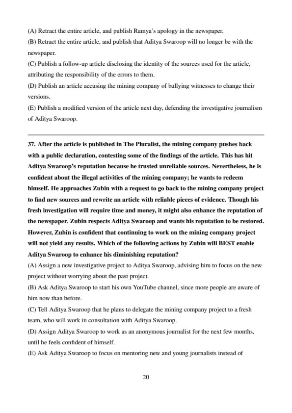 Its news editing team is led by Ms. Ramya Kattabomman, a respected veteran in the newspaper reporting industry, well- known for her stringent adherence to the ethical standards of newspaper reporting. Mr. Aditya Swaroop Verma, an award-winning senior journalist, has brought in an exposé into the activities of a mining company, operating in an ecologically vulnerable area. In his hard- hitting reporting style, he has presented interviews with tens of people, delineating how the mining company has used illegal means to start mining in that area. These mining activities may lead to the destruction of the local ecological balance. However, Aditya Swaroop is unable to obtain an interview with the management of the mining company. Aditya Swaroop's investigative report article offers significant revelations about the alleged illegal activities of the mining company which were hardly covered in the media otherwise. Nevertheless, his sources have requested for complete anonymity.