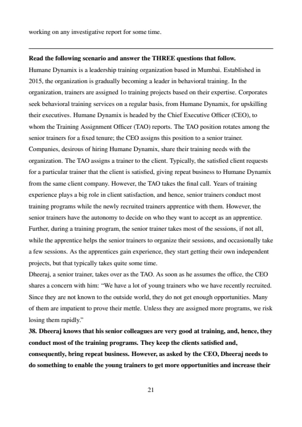 Humane Dynamix is a leadership training organization based in Mumbai. Established in 2015, the organization is gradually becoming a leader in behavioral training. In the organization, trainers are assigned 1o training projects based on their expertise. Corporates seek behavioral training services on a regular basis, from Humane Dynamix, for upskilling their executives. Humane Dynamix is headed by the Chief Executive Officer (CEO), to whom the Training Assignment Officer (TAO) reports. The TAO position rotates among the senior trainers for a fixed tenure; the CEO assigns this position to a senior trainer.