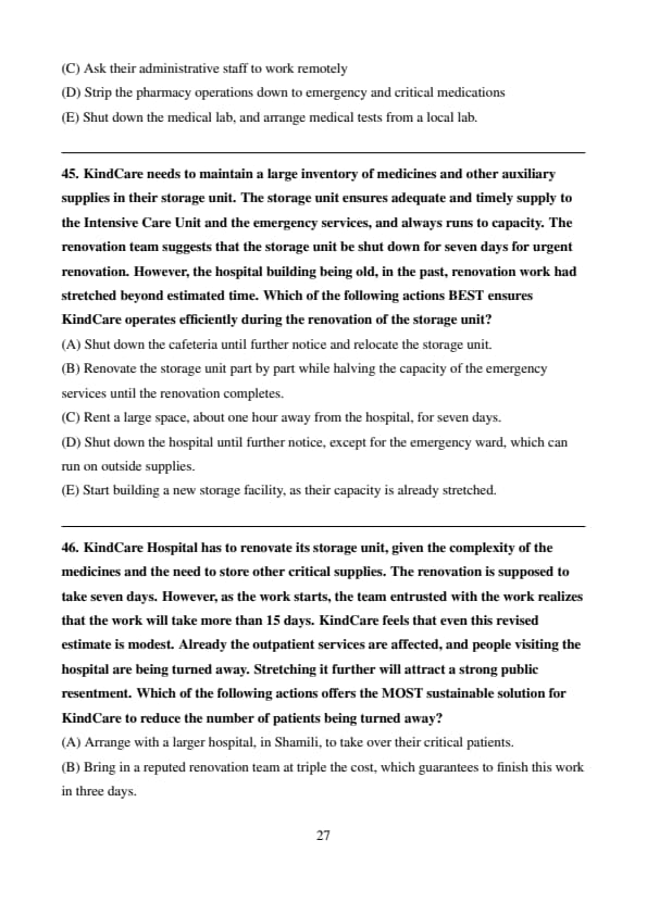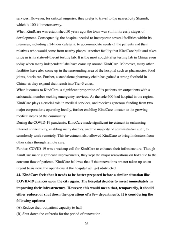 KindCare feels that it needs to be better prepared before a similar situation like COVID-19 chances upon the city again. The hospital decides to invest immediately in improving their infrastructure. However, this would mean that, temporarily, it should either reduce, or shut down the operations of a few departments. It is considering the following options: