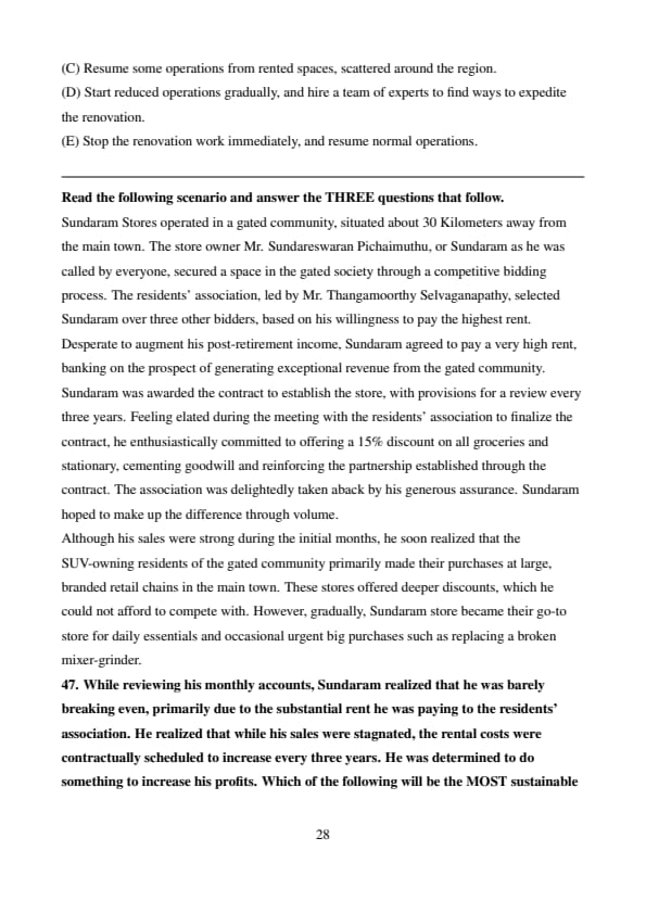Sundaram Stores operated in a gated community, situated about 30 Kilometers away from the main town. The store owner Mr. Sundareswaran Pichaimuthu, or Sundaram as he was called by everyone, secured a space in the gated society through a competitive bidding process. The residents' association, led by Mr. Thangamoorthy Selvaganapathy, selected Sundaram over three other bidders, based on his willingness to pay the highest rent. Desperate to augment his post-retirement income, Sundaram agreed to pay a very high rent, banking on the prospect of generating exceptional revenue from the gated community.
