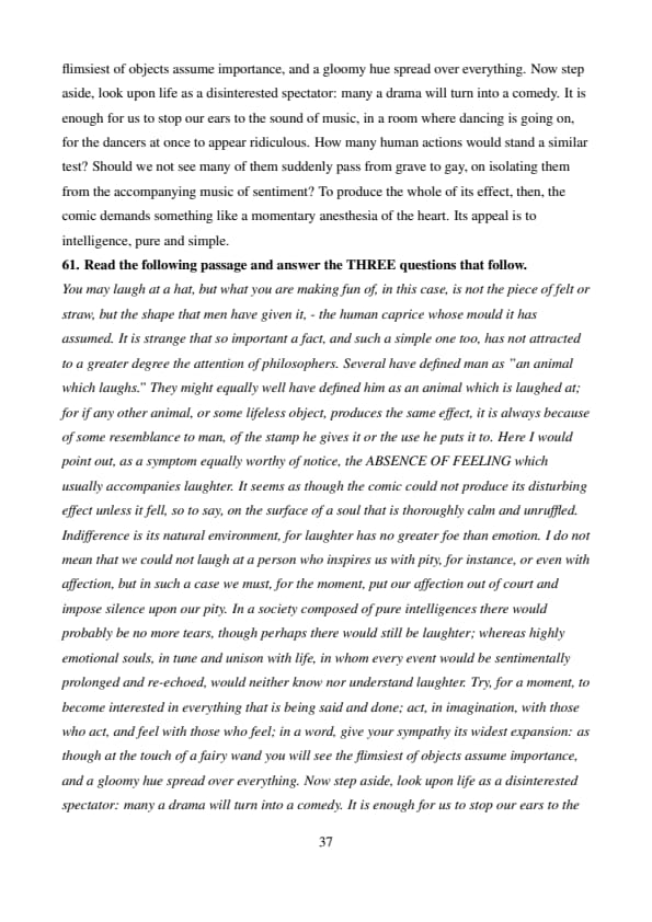 You may laugh at a hat, but what you are making fun of, in this case, is not the piece of felt or straw, but the shape that men have given it, - the human caprice whose mould it has assumed. It is strange that so important a fact, and such a simple one too, has not attracted to a greater degree the attention of philosophers. Several have defined man as "an animal which laughs." They might equally well have defined him as an animal which is laughed at; for if any other animal, or some lifeless object, produces the same effect, it is always because of some resemblance to man, of the stamp he gives it or the use he puts it to. Here I would point out, as a symptom equally worthy of notice, the ABSENCE OF FEELING which usually accompanies laughter. It seems as though the comic could not produce its disturbing effect unless it fell, so to say, on the surface of a soul that is thoroughly calm and unruffled. Indifference is its natural environment, for laughter has no greater foe than emotion. I do not mean that we could not laugh at a person who inspires us with pity, for instance, or even with affection, but in such a case we must, for the moment, put our affection out of court and impose silence upon our pity. In a society composed of pure intelligences there would probably be no more tears, though perhaps there would still be laughter; whereas highly emotional souls, in tune and unison with life, in whom every event would be sentimentally prolonged and re-echoed, would neither know nor understand laughter. Try, for a moment, to become interested in everything that is being said and done; act, in imagination, with those who act, and feel with those who feel; in a word, give your sympathy its widest expansion: as though at the touch of a fairy wand you will see the flimsiest of objects assume importance, and a gloomy hue spread over everything. Now step aside, look upon life as a disinterested spectator: many a drama will turn into a comedy. It is enough for us to stop our ears to the sound of music, in a room where dancing is going on, for the dancers at once to appear ridiculous. How many human actions would stand a similar test? Should we not see many of them suddenly pass from grave to gay, on isolating them from the accompanying music of sentiment? To produce the whole of its effect, then, the comic demands something like a momentary anesthesia of the heart. Its appeal is to intelligence, pure and simple.
