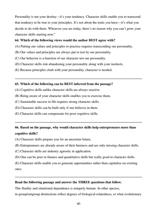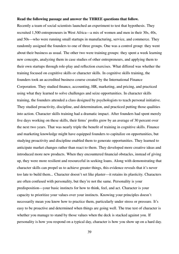 Recently a team of social scientists launched an experiment to test that hypothesis. They recruited 1,500 entrepreneurs in West Africa—a mix of women and men in their 30s, 40s, and 50s—who were running small startups in manufacturing, service, and commerce. They randomly assigned the founders to one of three groups. One was a control group: they went about their business as usual. The other two were training groups: they spent a week learning new concepts, analyzing them in case studies of other entrepreneurs, and applying them to their own startups through role-play and reflection exercises. What differed was whether the training focused on cognitive skills or character skills. In cognitive skills training, the founders took an accredited business course created by the International Finance Corporation. They studied finance, accounting, HR, marketing, and pricing, and practiced using what they learned to solve challenges and seize opportunities. In character skills training, the founders attended a class designed by psychologists to teach personal initiative. They studied proactivity, discipline, and determination, and practiced putting those qualities into action. Character skills training had a dramatic impact. After founders had spent merely five days working on these skills, their firms' profits grew by an average of 30 percent over the next two years. That was nearly triple the benefit of training in cognitive skills. Finance and marketing knowledge might have equipped founders to capitalize on opportunities, but studying proactivity and discipline enabled them to generate opportunities. They learned to anticipate market changes rather than react to them. They developed more creative ideas and introduced more new products. When they encountered financial obstacles, instead of giving up, they were more resilient and resourceful in seeking loans. Along with demonstrating that character skills can propel us to achieve greater things, this evidence reveals that it's never too late to build them... Character doesn't set like plaster—it retains its plasticity. Characters are often confused with personality, but they're not the same. Personality is your predisposition—your basic instincts for how to think, feel, and act. Character is your capacity to prioritize your values over your instincts. Knowing your principles doesn't necessarily mean you know how to practice them, particularly under stress or pressure. It's easy to be proactive and determined when things are going well. The true test of character is whether you manage to stand by those values when the deck is stacked against you. If personality is how you respond on a typical day, character is how you show up on a hard day. Personality is not your destiny—it's your tendency. Character skills enable you to transcend that tendency to be true to your principles. It's not about the traits you have—it's what you decide to do with them. Wherever you are today, there's no reason why you can't grow your character skills starting now."