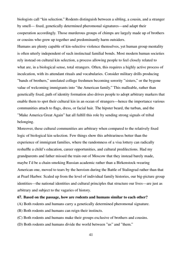 This fluidity and situational dependence is uniquely human. In other species, in-group/outgroup distinctions reflect degrees of biological relatedness, or what evolutionary biologists call “kin selection.” Rodents distinguish between a sibling, a cousin, and a stranger by smell— fixed, genetically determined pheromonal signatures—and adapt their cooperation accordingly. Those murderous groups of chimps are largely made up of brothers or cousins who grew up together and predominantly harm outsiders. Humans are plenty capable of kin-selective violence themselves, yet human group mentality is often utterly independent of such instinctual familial bonds. Most modern human societies rely instead on cultural kin selection, a process allowing people to feel closely related to what are, in a biological sense, total strangers. Often, this requires a highly active process of inculcation, with its attendant rituals and vocabularies. Consider military drills producing "bands of brothers," unrelated college freshmen becoming sorority "sisters," or the bygone value of welcoming immigrants into "the American family." This malleable, rather than genetically fixed, path of identity formation also drives people to adopt arbitrary markers that enable them to spot their cultural kin in an ocean of strangers—hence the importance various communities attach to flags, dress, or facial hair. The hipster beard, the turban, and the "Make America Great Again” hat all fulfill this role by sending strong signals of tribal belonging. Moreover, these cultural communities are arbitrary when compared to the relatively fixed logic of biological kin selection. Few things show this arbitrariness better than the experience of immigrant families, where the randomness of a visa lottery can radically reshuffle a child's education, career opportunities, and cultural predilections. Had my grandparents and father missed the train out of Moscow that they instead barely made, maybe I'd be a chain-smoking Russian academic rather than a Birkenstock-wearing American one, moved to tears by the heroism during the Battle of Stalingrad rather than that at Pearl Harbor. Scaled up from the level of individual family histories, our big-picture group identities—the national identities and cultural principles that structure our lives—are just as arbitrary and subject to the vagaries of history.