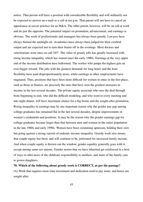 Work, for many on the career track, is greedy. The individual who puts in overtime, weekend time, or evening time will earn a lot more—so much more that, even on an hourly basis, the person is earning more.... The greediness of work means that couples with children or other care responsibilities would gain by doing a bit of specialization. This specialization doesn't mean catapulting back to the world of Leave It to Beaver. Women will still pursue demanding careers. But one member of the couple will be on call at home, ready to leave the office or workplace at a moment's notice. That person will have a position with considerable flexibility and will ordinarily not be expected to answer an e-mail or a call at ten p.m. That parent will not have to cancel an appearance at soccer practice for an M&A. The other parent, however, will be on call at work and do just the opposite. The potential impact on promotion, advancement, and earnings is obvious. The work of professionals and managers has always been greedy. Lawyers have always burned the midnight oil. Academics have always been judged for their cerebral output and are expected not to turn their brains off in the evenings. Most doctors and veterinarians were once on call 24/7. The value of greedy jobs has greatly increased with rising income inequality, which has soared since the early 1980s. Earnings at the very upper end of the income distribution have ballooned. The worker who jumps the highest gets an ever-bigger reward. The jobs with the greatest demands for long hours and the least flexibility have paid disproportionately more, while earnings in other employments have stagnated. Thus, positions that have been more difficult for women to enter in the first place, such as those in finance, are precisely the ones that have seen the greatest increases in income in the last several decades. The private equity associate who sees the deal through from beginning to end, who did the difficult modeling, and who went to every meeting and late-night dinner, will have maximum chance for a big bonus and the sought-after promotion. Rising inequality in earnings may be one important reason why the gender pay gap among college graduates has remained flat in the last several decades, despite improvements in women's credentials and positions. It may be the reason why the gender earnings gap for college graduates became larger than that between men and women in the entire population in the late 1980s and early 1990s. Women have been swimming upstream, holding their own but going against a strong current of endemic income inequality. Greedy work also means that couple equity has been, and will continue to be, jettisoned for increased family income. And when couple equity is thrown out the window, gender equality generally goes with it, except among same-sex unions. Gender norms that we have inherited get reinforced in a host of ways to allot more of the childcare responsibility to mothers, and more of the family care to grown daughters.