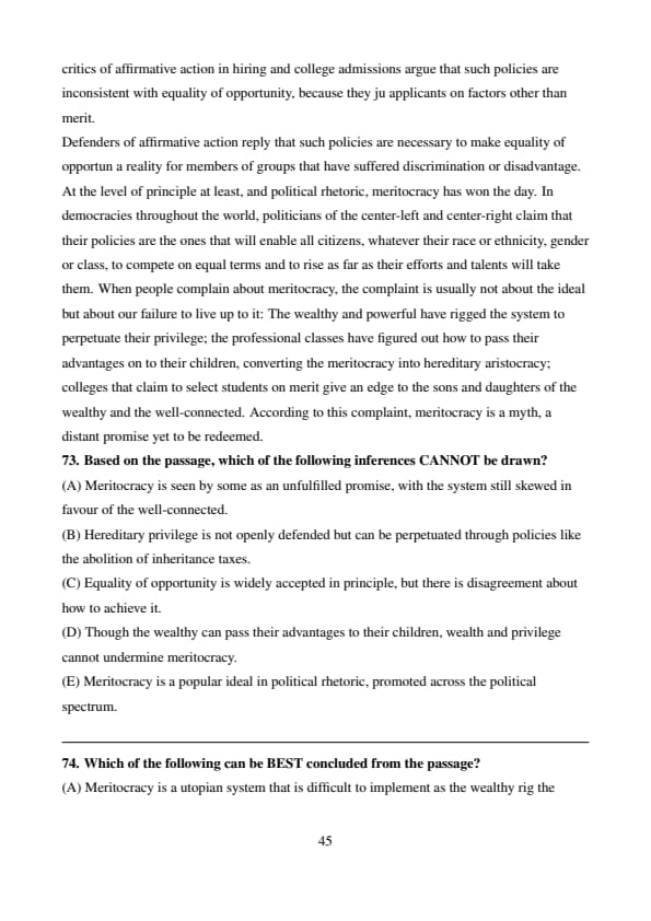 No one argues that the rich should be rich because they were born to wealthy parents. Critics of inequality may complain that those who would abolish inheritance taxes, say, are implicitly endorsing hereditary privilege. But no one defends hereditary privilege outright or disputes the principle that careers should be open to talents. Most of our debates about access to jobs, education, and public office proceed from premise of equal opportunity. Our disagreements are less about the principle itself than about what it requires. For example, critics of affirmative action in hiring and college admissions argue that such policies are inconsistent with equality of opportunity, because they ju applicants on factors other than merit. Defenders of affirmative action reply that such policies are necessary to make equality of opportun a reality for members of groups that have suffered discrimination or disadvantage. At the level of principle at least, and political rhetoric, meritocracy has won the day. In democracies throughout the world, politicians of the center-left and center-right claim that their policies are the ones that will enable all citizens, whatever their race or ethnicity, gender or class, to compete on equal terms and to rise as far as their efforts and talents will take them. When people complain about meritocracy, the complaint is usually not about the ideal but about our failure to live up to it: The wealthy and powerful have rigged the system to perpetuate their privilege; the professional classes have figured out how to pass their advantages on to their children, converting the meritocracy into hereditary aristocracy; colleges that claim to select students on merit give an edge to the sons and daughters of the wealthy and the well-connected. According to this complaint, meritocracy is a myth, a distant promise yet to be redeemed.
