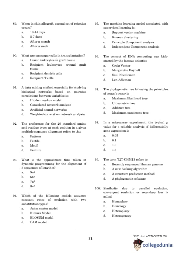 The time complexity for dynamic programming for aligning three sequences is \(O(n^3)\), which corresponds to the option \(7n^3\). Quick Tip: Dynamic programming for sequence alignment with 3 sequences has a time complexity of \(O(n^3)\), where \(n\) is the sequence length.