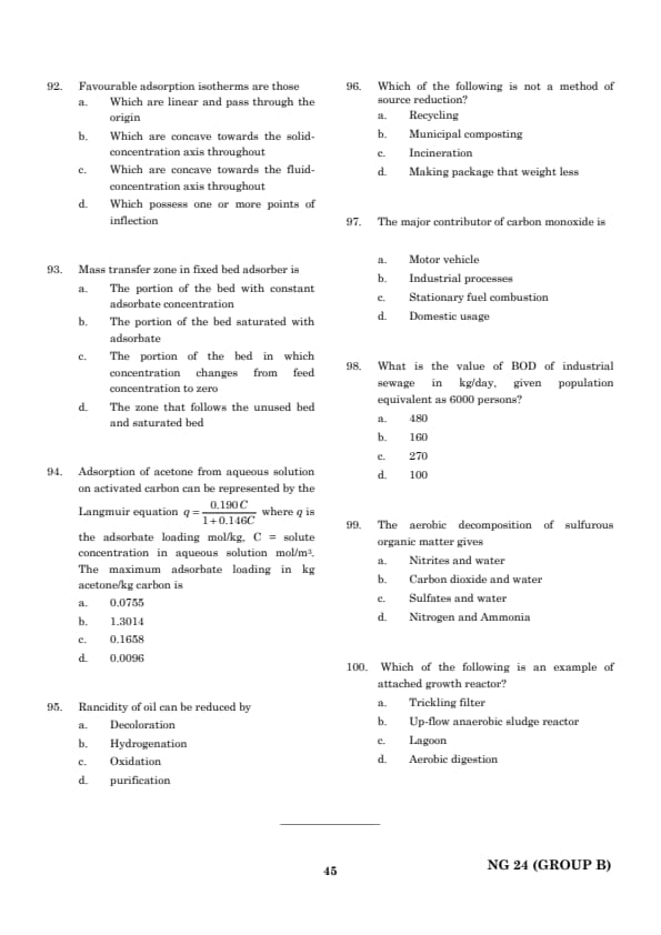 The maximum adsorbate loading is 0.0755, as given by option (a). Quick Tip: In Langmuir adsorption, the maximum adsorbate loading is obtained when the solute concentration tends to zero. Use the Langmuir equation to calculate the maximum adsorption capacity.