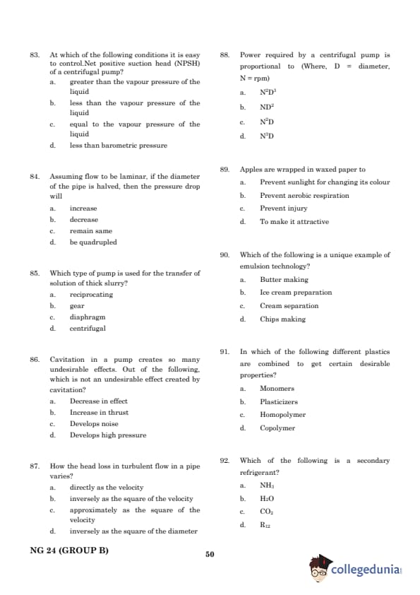 Since power varies as \( N^3D \), the correct answer is (d) \( N^3D \). Quick Tip: For centrifugal pumps, power requirement follows \( P \propto N^3D \), meaning higher speeds require exponentially more power.