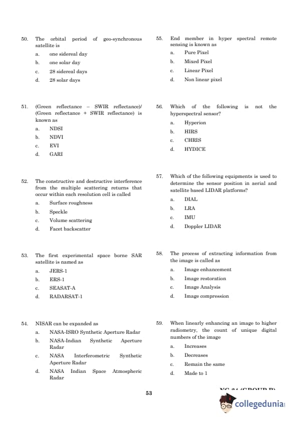 Since SAR is primarily used for moisture content assessment, the correct answer is d. Moisture content of the crop. Quick Tip: SAR (Synthetic Aperture Radar) is best suited for moisture content estimation, while multispectral indices (e.g., NDVI, EVI) are used for vegetation health monitoring.