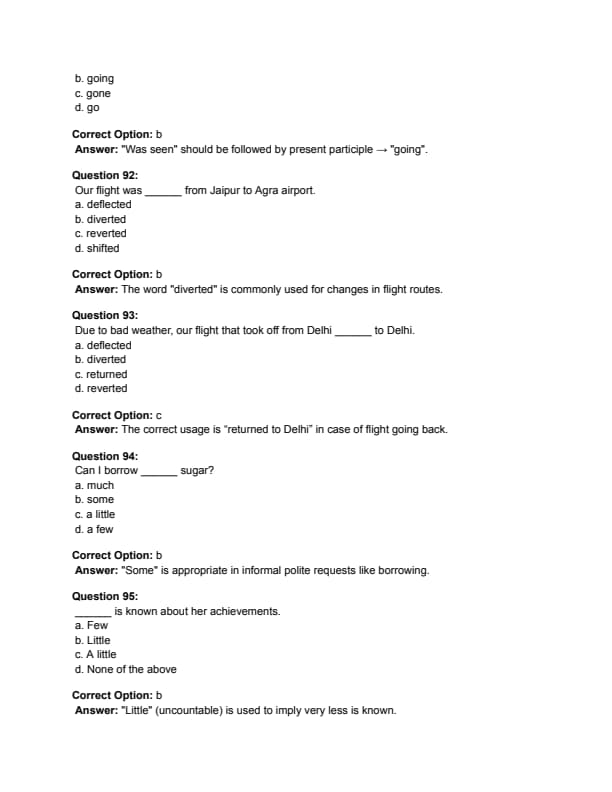 The word "some" is most appropriate in informal, polite requests like borrowing something. "Much" is typically used for uncountable nouns in negative or interrogative sentences but is not appropriate for requests. "A little" is also acceptable but less common for this context. "A few" is used with countable nouns, making it incorrect in this case where "sugar" is uncountable. Therefore, the most suitable word is "some." Quick Tip: In informal requests, "some" is commonly used when asking for an unspecified amount of an uncountable noun like sugar, water, etc.