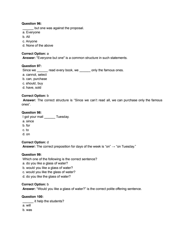 "Would you like a glass of water?" is the grammatically correct polite offering sentence. This is a standard way to offer something to someone. Quick Tip: "Would you like" is a polite way to offer something to someone.