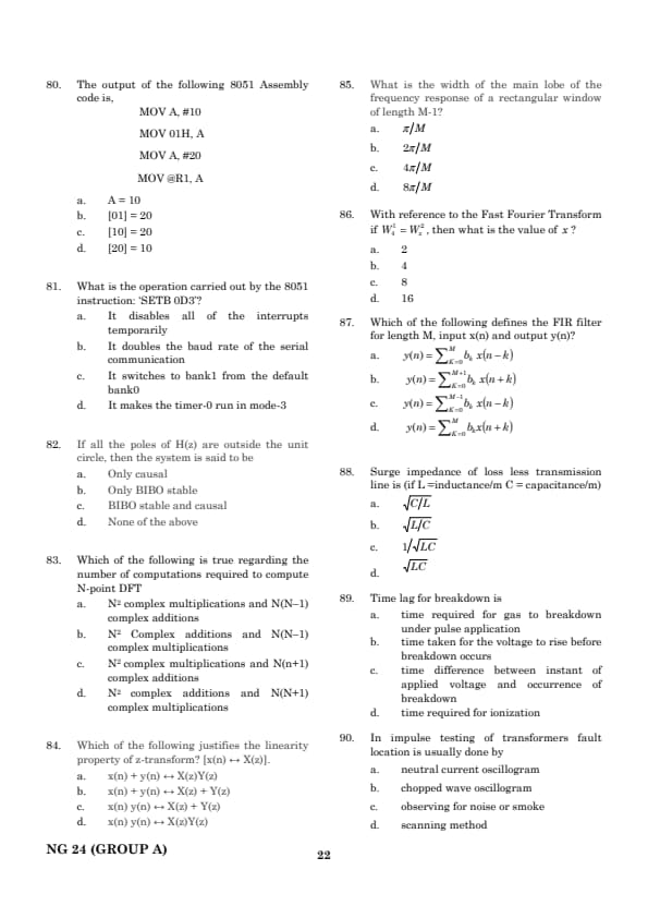 Step 1: Find the Z-transform of \( x(n) \). Since \( x(n) = \delta(n - k) \), its Z-transform is: \[ X(z) = z^{-k}. \] Step 2: Find the RO(C) - The function \( z^{-k} \) is well-defined for all \( z \neq 0 \). - So, the ROC is entire \( z \)-plane except \( z = 0 \). Step 3: Selecting the correct option. Since the correct ROC is entire \( z \)-plane except at \( z = 0 \), the answer is (C). Quick Tip: For \( x(n) = \delta(n - k) \), the Z-transform is \( X(z) = z^{-k} \), with ROC excluding \( z = 0 \).