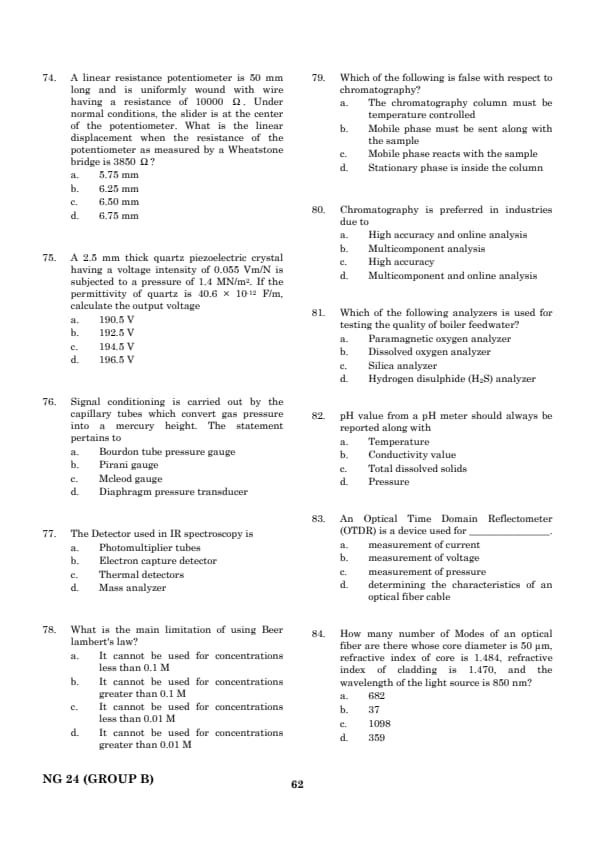 Instrumentation, electronics and control engineering (M.Tech.) consists of 100 questions divided into three sections: Part I (Engineering Mathematics - 20 questions), Part II (Basic Engineering & Sciences - 20 questions), and Part III ( Instrumentation, electronics and control engineering - 60 questions). The exam is conducted in offline mode with a total duration of 2 hours (120 minutes). Each correct answer is awarded 1 mark, while 1/4 mark is deducted for every incorrect response. Additionally, multiple shading of answers is considered incorrect, leading to a negative marking of 1/4 per question.