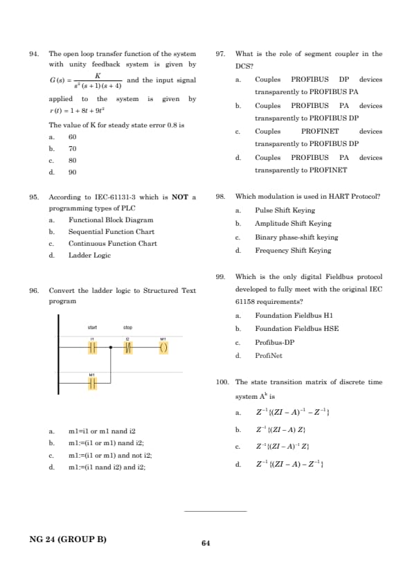 Thus, the correct answer is (c) Continuous Function Chart. Quick Tip: IEC-61131-3 defines several PLC programming languages, but Continuous Function Chart is not one of the standard types.