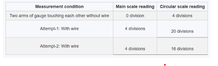 Area of the cross-section of a wire is measured using a screw gauge. The pitch of the main scale is 0.5 mm. The circular scale has 100 divisions and for one full rotation of the circular scale, the main scale shifts by two divisions. The measured readings are listed below.