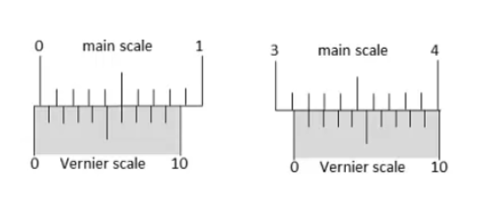 The smallest division on the main scale of a Vernier calipers is 0.1 cm. Ten divisions of the Vernier scale correspond to nine divisions of the main scale. The figure below on the left shows the reading of this calipers with no gap between its two jaws. The figure on the right shows the reading with a solid sphere held between the jaws. The correct diameter of the sphere is
