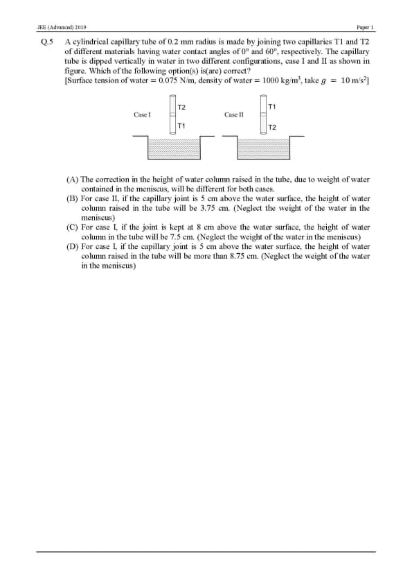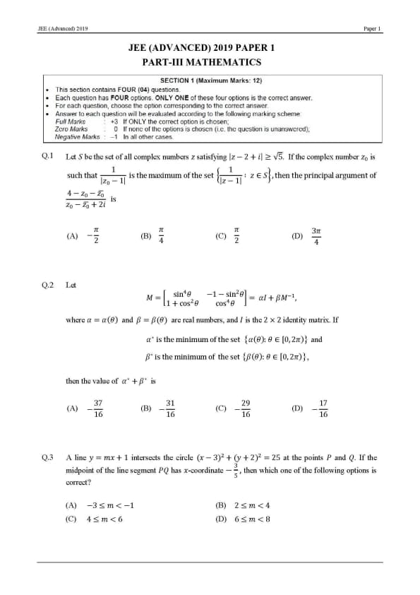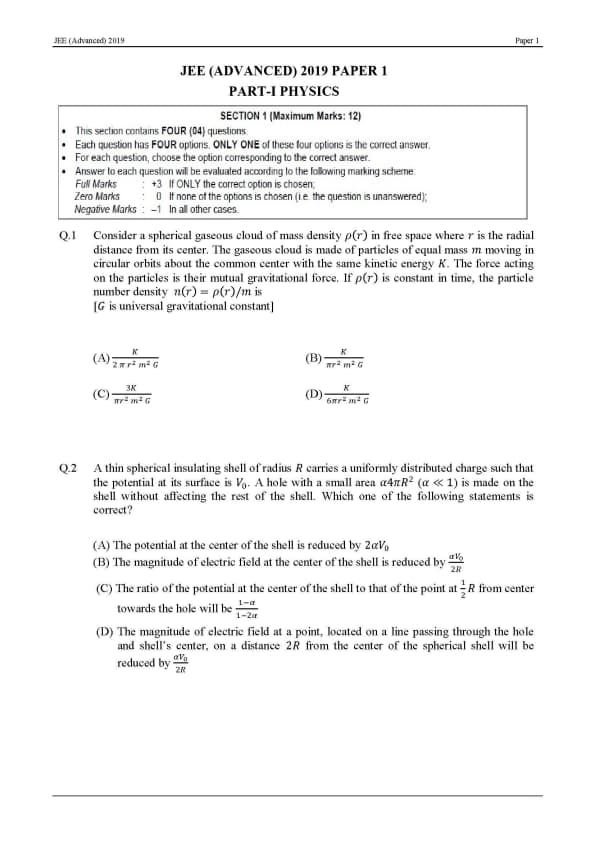JEE Advanced 2019 Paper 1 Question Paper with Answer Key PDF in English