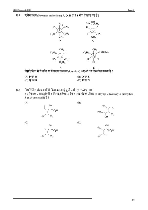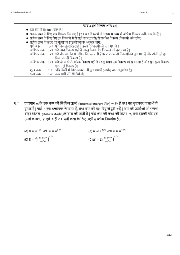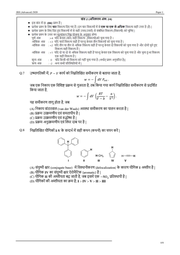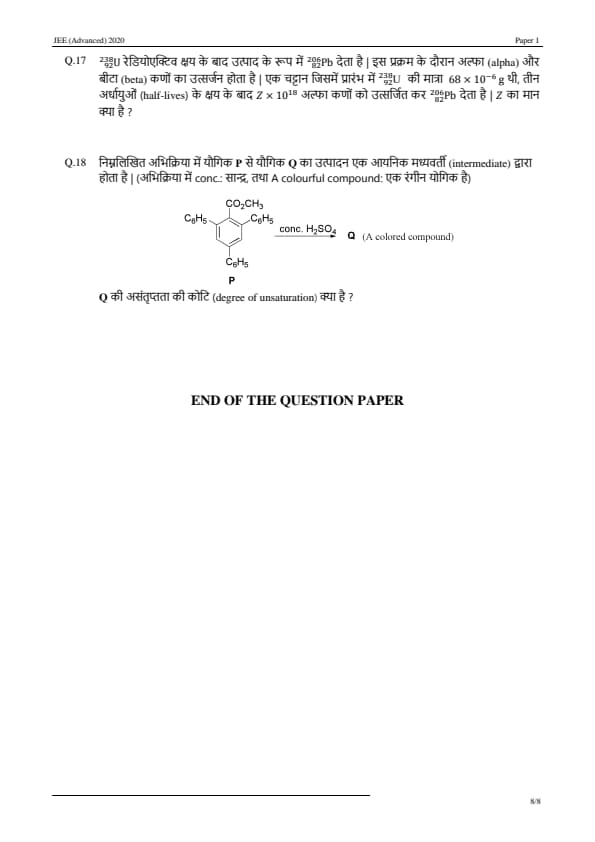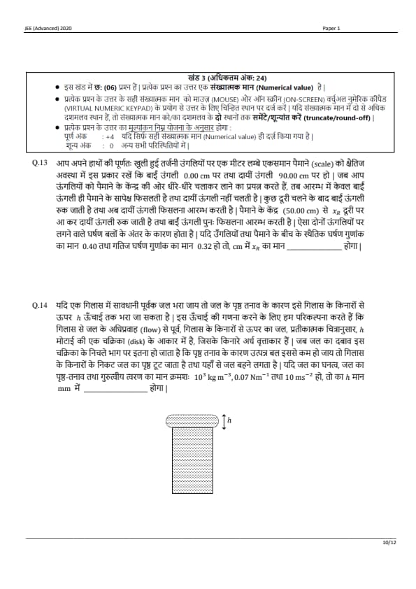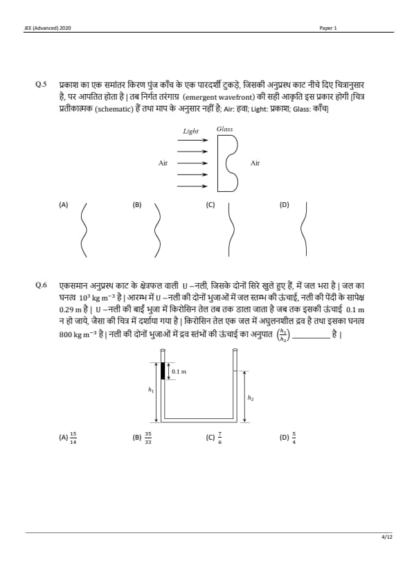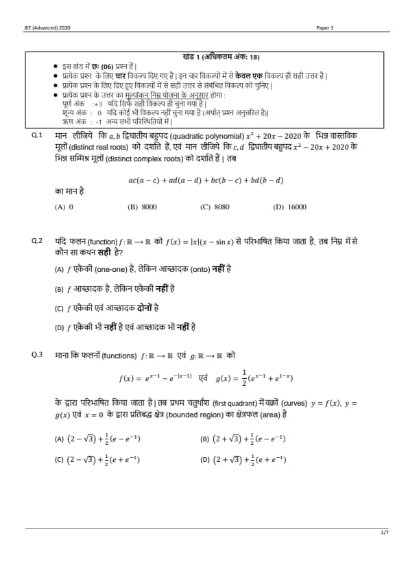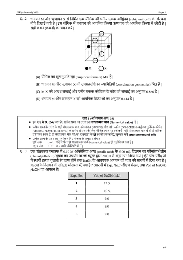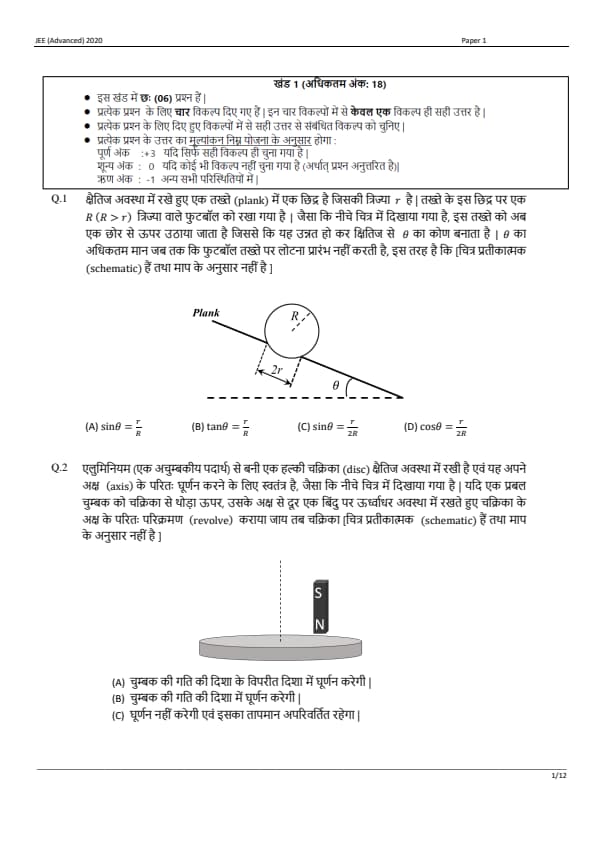 JEE Advanced 2020 Paper 1 Question Paper with Answer Key PDF in Hindi