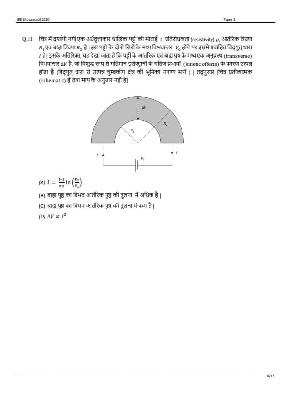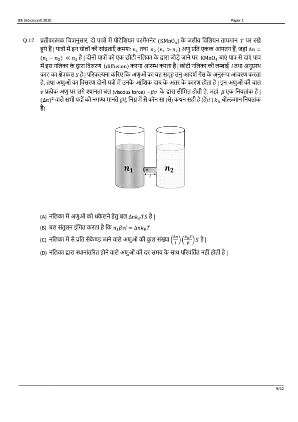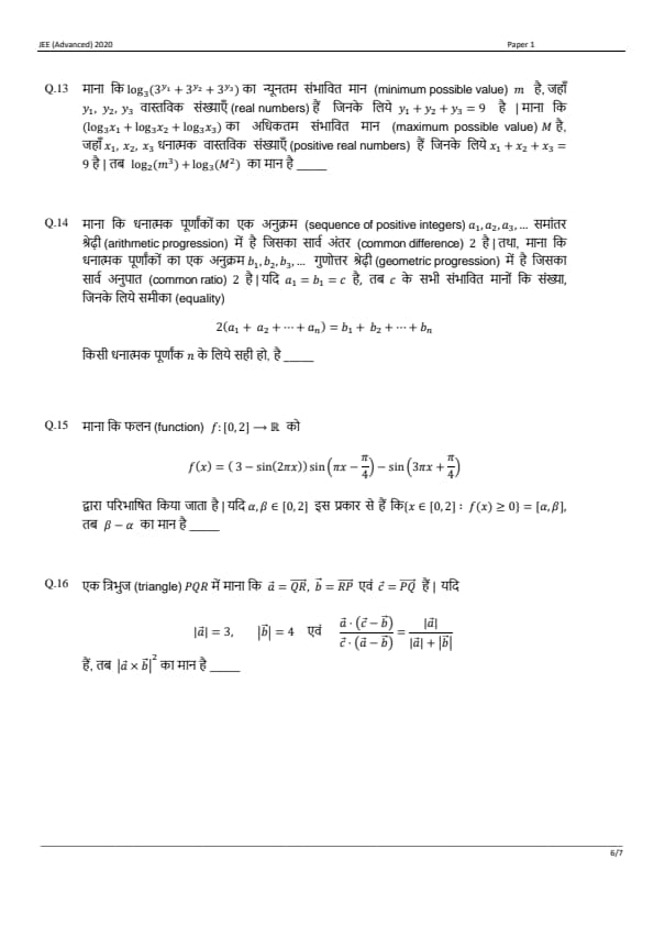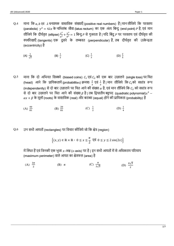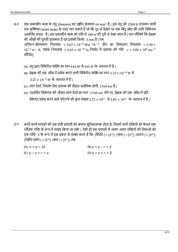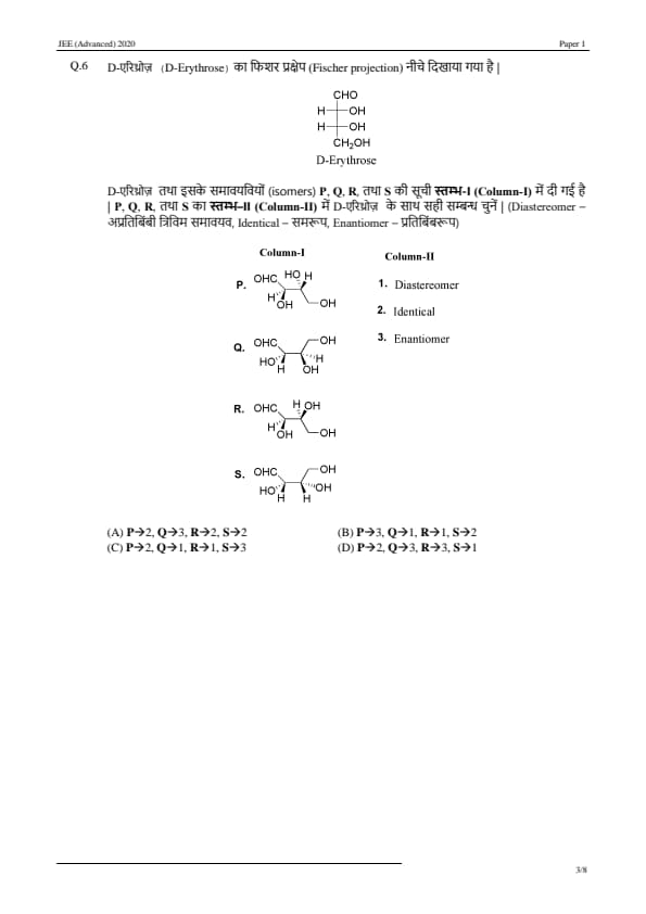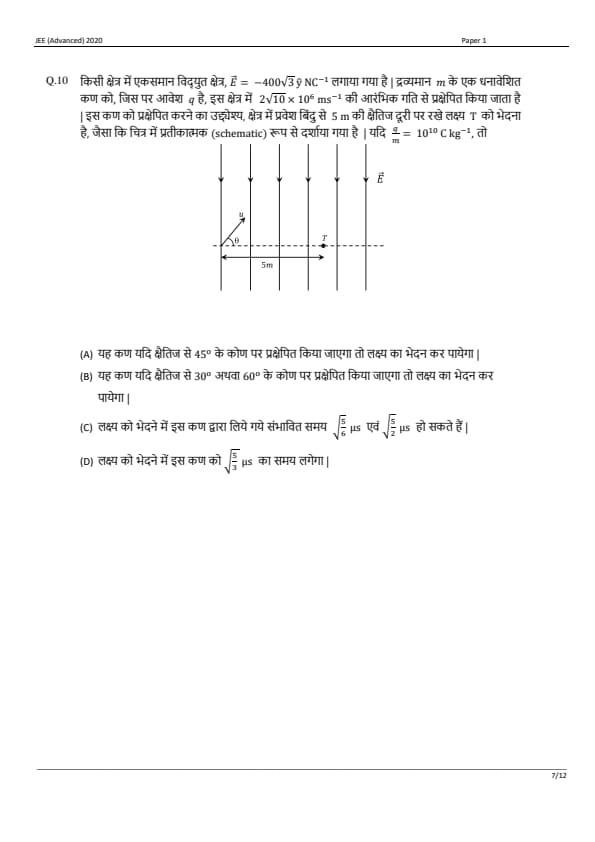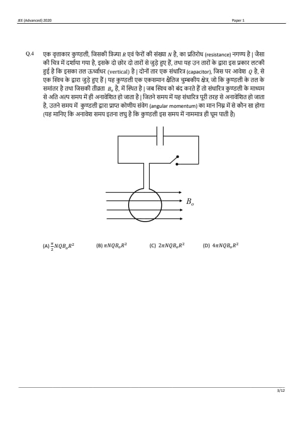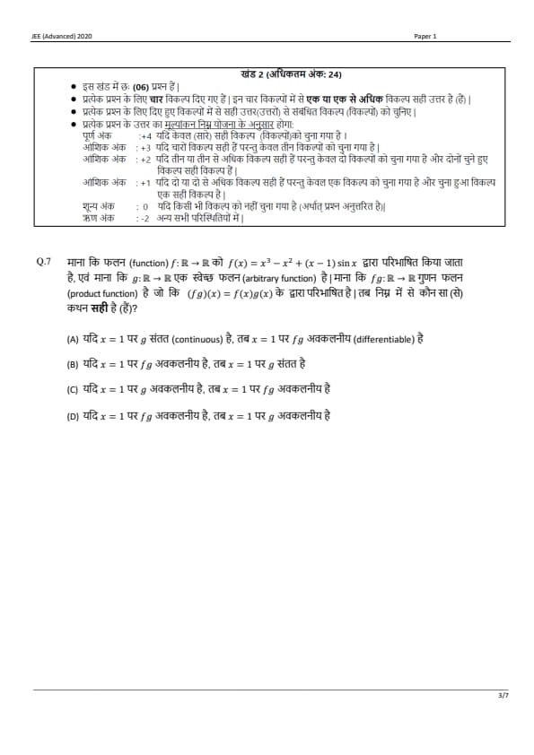 JEE Advanced 2020 Paper 1 Question Paper with Answer Key PDF in Hindi