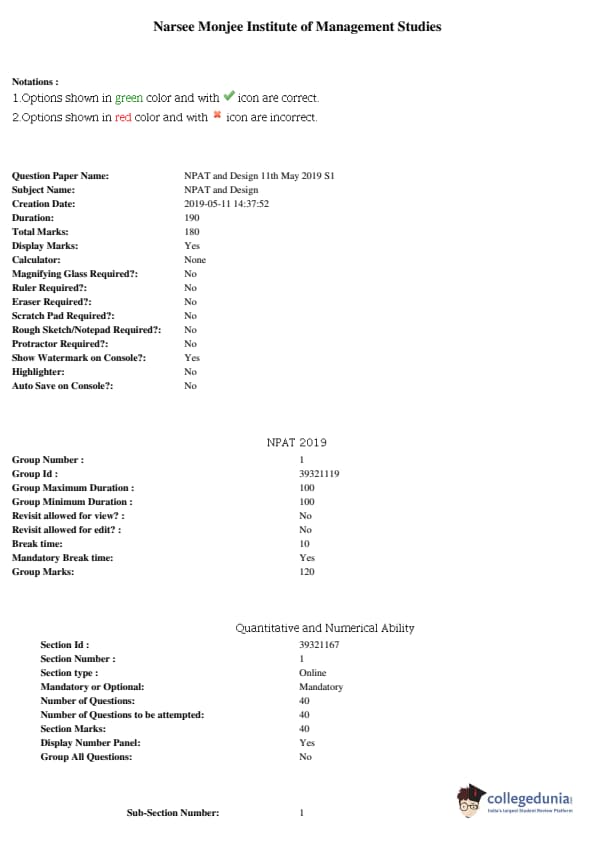 NPAT 2019 NPAT Design Question paper with answer key pdf conducted on May 11, 2019 is available for download. The exam was successfully organized by Narsee Monjee Institute for Management Studies (NMIMS). The question paper comprised a total of 180 questions.