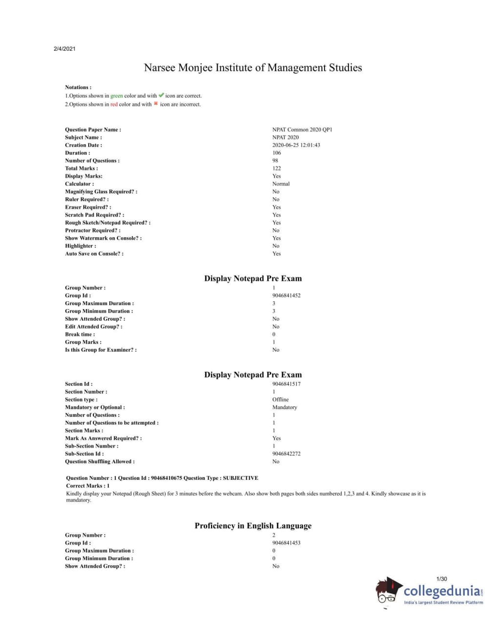 NPAT 2020 Common Question paper with answer key pdf conducted on June 2020 for QP 1 is available for download. The exam was successfully organized by Narsee Monjee Institute for Management Studies (NMIMS). The question paper comprised a total of 120 questions.