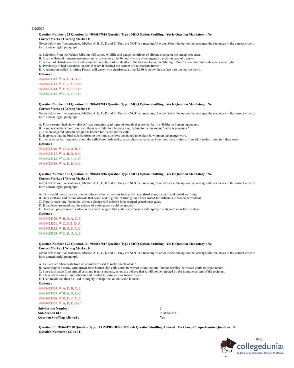 The correct order is C, A, E, B, D. First, C introduces the team of British scientists. Then A discusses the survey and its purpose. E talks about the submarine and its ability to descend. B explains its features, and D gives additional information about its previous descent. Quick Tip: When arranging jumbled sentences, identify the introductory sentence and build the narrative logically from there.