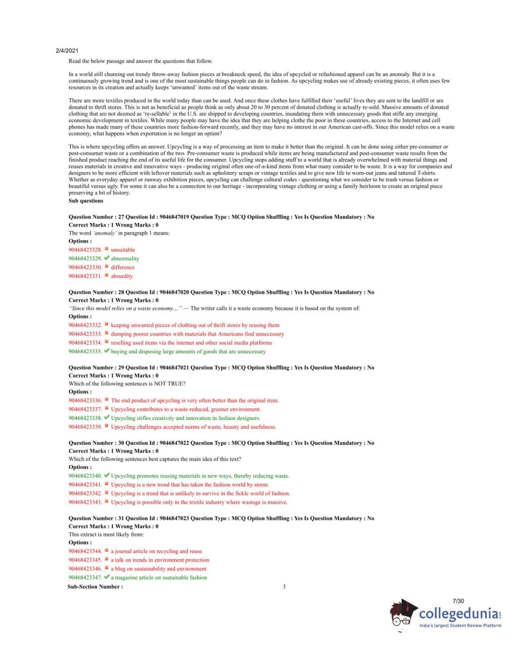 The extract discusses upcycling, waste, and fashion, which points to it being a magazine article on sustainable fashion. Quick Tip: When identifying the source of an extract, look for keywords related to the content's focus, such as "fashion" or "environment."