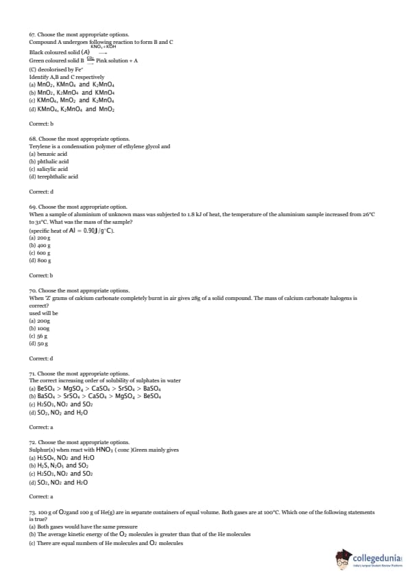 Compound A undergoes the following reaction to form B and C: \[ KNO_3 + KOH \to Black coloured solid (A) \xrightarrow{heated} Green coloured solid B + Pink solution + A (C decolorised by Fe^{2+}) \]