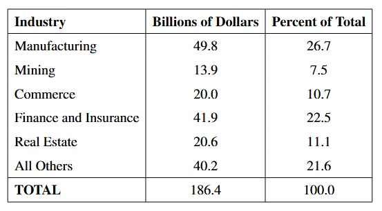 The table provides the data for Japanese Direct Foreign Investment from 1951-1988, broken down by industry. It includes the total investment in billions of dollars and the corresponding percentage of the total investment for each industry.
