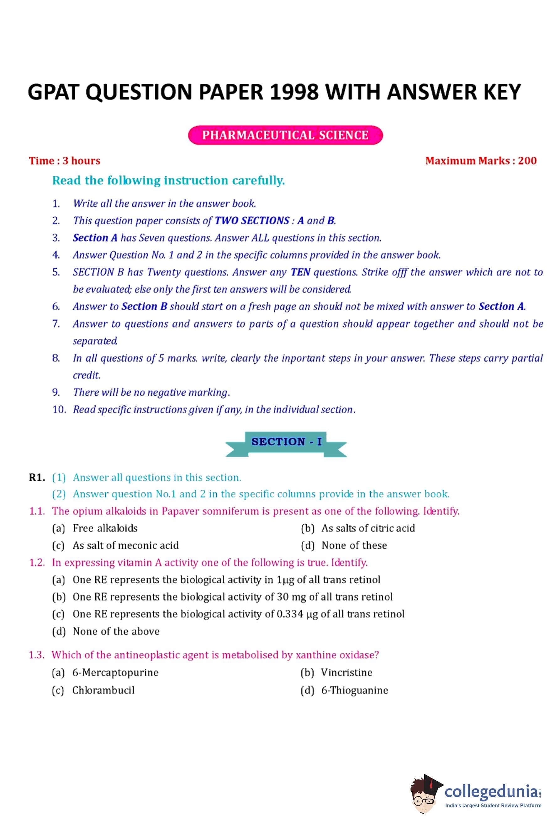 | GPAT 1998 Question Paper PDF | GPAT 1998 Answer Key PDF |