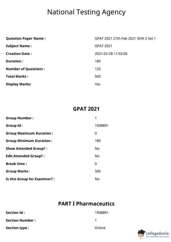 GPAT 2021 Question Paper with Answer Key pdf is available for download. The exam was conducted by National Testing Agency (NTA) on February 27, 2021. The question paper comprised a total of 125 questions divided among 5 sections.