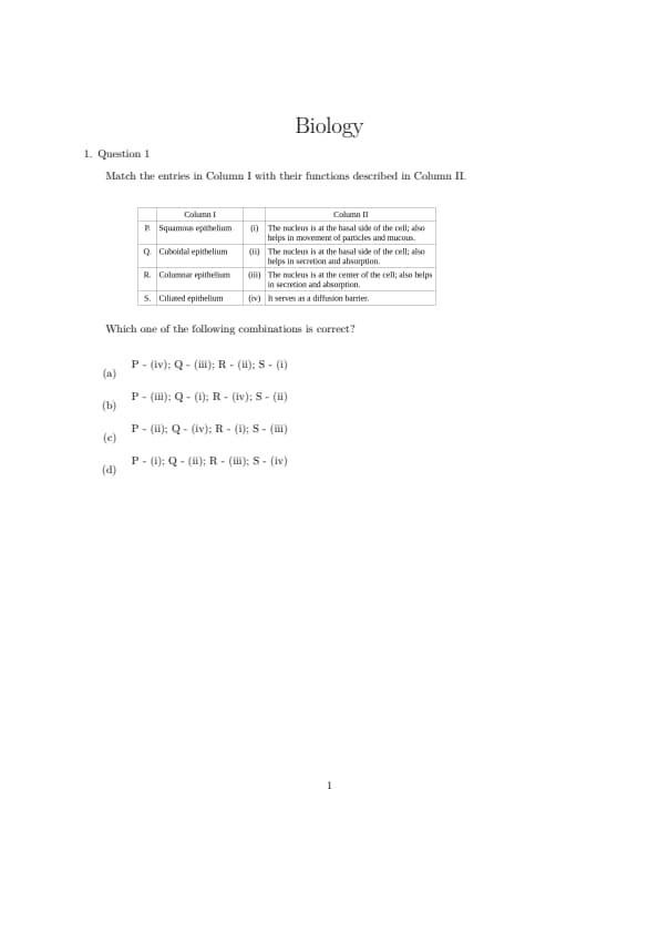 Thus, the correct combination is: \[ P - (iv); Q - (iii); R - (ii); S - (i) \] Quick Tip: For matching types of tissues with their functions, focus on their structural features such as the location of the nucleus and their role in secretion, absorption, or movement.