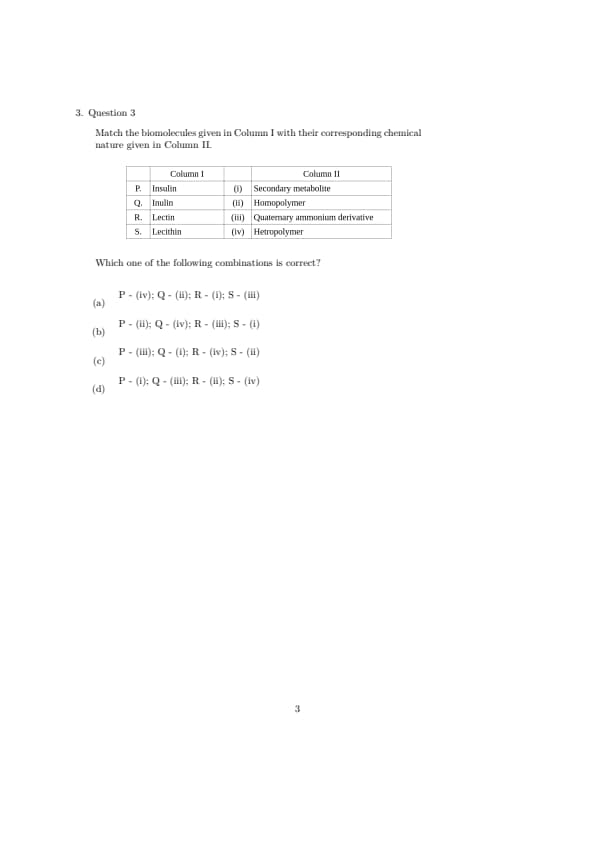 Conclusion: Based on these explanations, the correct combination is: \[ P - (iv); Q - (ii); R - (i); S - (iii) \] Quick Tip: When matching biomolecules to their chemical nature, remember: