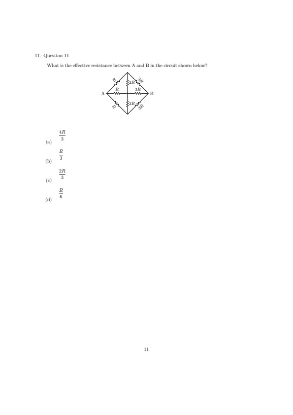 \[ R_{eq} = \frac{4R}{3}. \] Quick Tip: Using symmetry can greatly simplify complex resistor networks, and the Y transformation is a powerful tool to convert triangles into star networks for easier calculations. Always carefully combine series and parallel resistors stepwise to avoid mistakes.