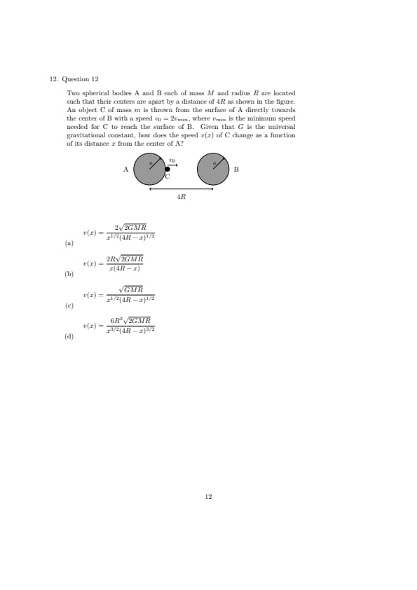Two spherical bodies A and B each of mass \(M\) and radius \(R\) are located such that their centers are apart by a distance of \(4R\) as shown in the figure. An object \(C\) of mass \(m\) is thrown from the surface of A directly towards the center of B with a speed \(v_0 = 2v_{min}\), where \(v_{min}\) is the minimum speed needed for \(C\) to reach the surface of B. Given that \(G\) is the universal gravitational constant, how does the speed \(v(x)\) of \(C\) change as a function of its distance \(x\) from the center of A?