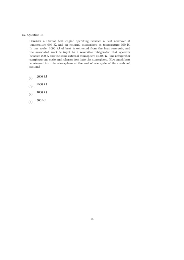 Step 8: Total heat released into the atmosphere by the combined system is the sum of heat rejected by the engine and heat released by the refrigerator: \[ Q_{total} = Q_C + Q'_C = 500 + 1500 = 2000 \, kJ. \] Quick Tip: Remember, for Carnot engines and refrigerators, efficiency and coefficient of performance depend on temperature ratios. The combined heat exchange considers contributions from both devices.