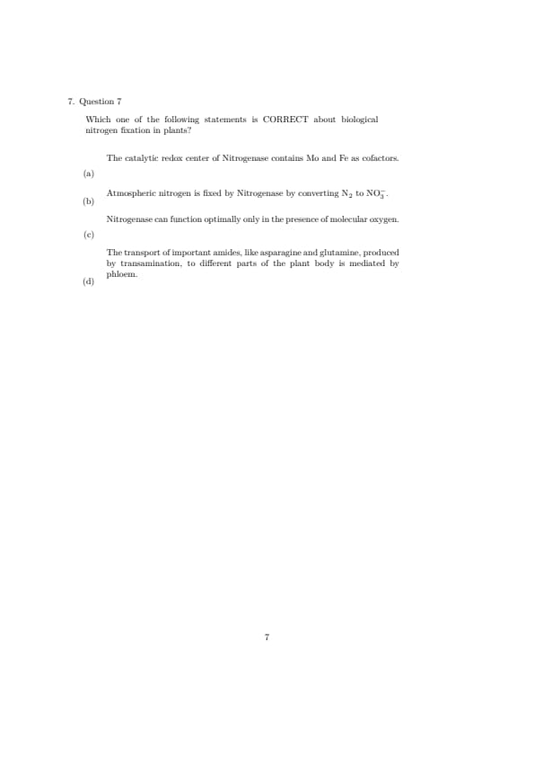 Thus, the correct answer is: \[ The catalytic redox center of Nitrogenase contains Mo and Fe as cofactors. \] Quick Tip: In biological nitrogen fixation, remember that nitrogenase contains Mo and Fe as cofactors and converts atmospheric nitrogen (\( N_2 \)) into ammonia (\( NH_3 \)), not nitrate.