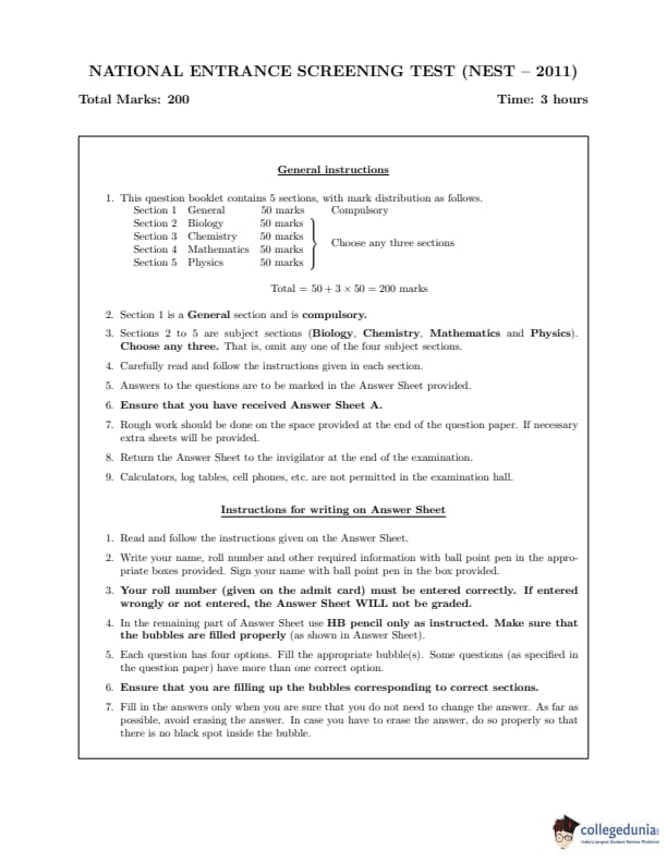| NEST 2011 Question Paper PDF | NEST 2011 Answer Key PDF |