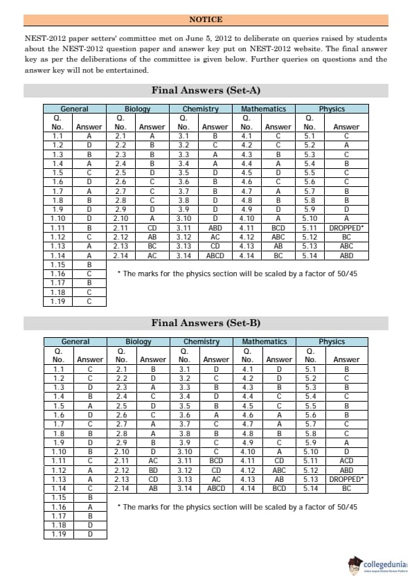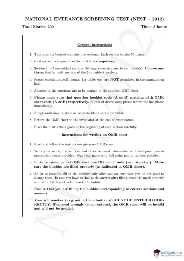 | NEST 2012 Question Paper PDF | NEST 2012 Answer Key PDF |
