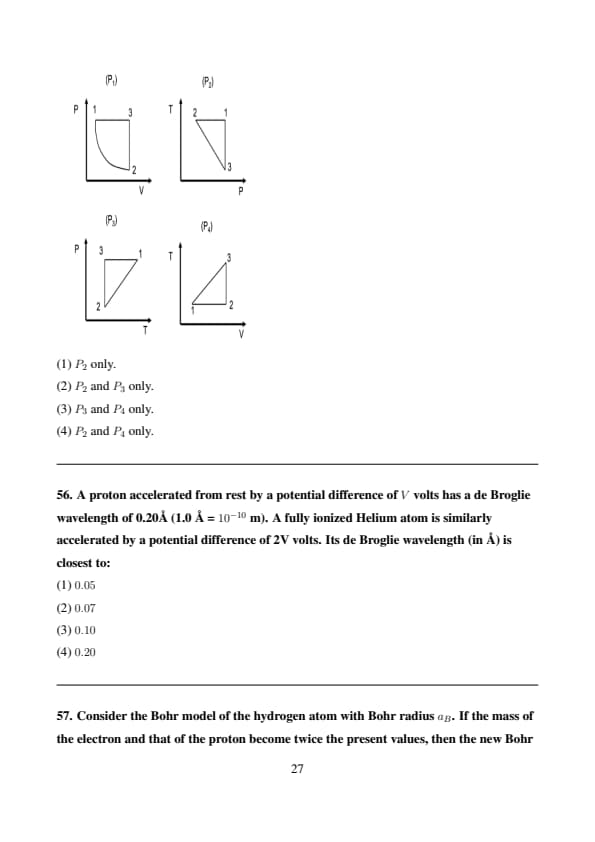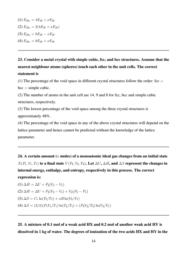 The correct statements about an ideal gas are (1) and (2). Quick Tip: Remember the definitions of adiabatic (\(Q=0\)), isobaric (\(P=constant\)), isothermal (\(T=constant\)), and isochoric (\(V=constant\)) processes. Also, recall the first law of thermodynamics (\(\Delta U = Q - W\)) and the definition of enthalpy (\(H = U + PV\)). For an ideal gas, internal energy depends only on temperature, and potential energy due to intermolecular forces is zero.