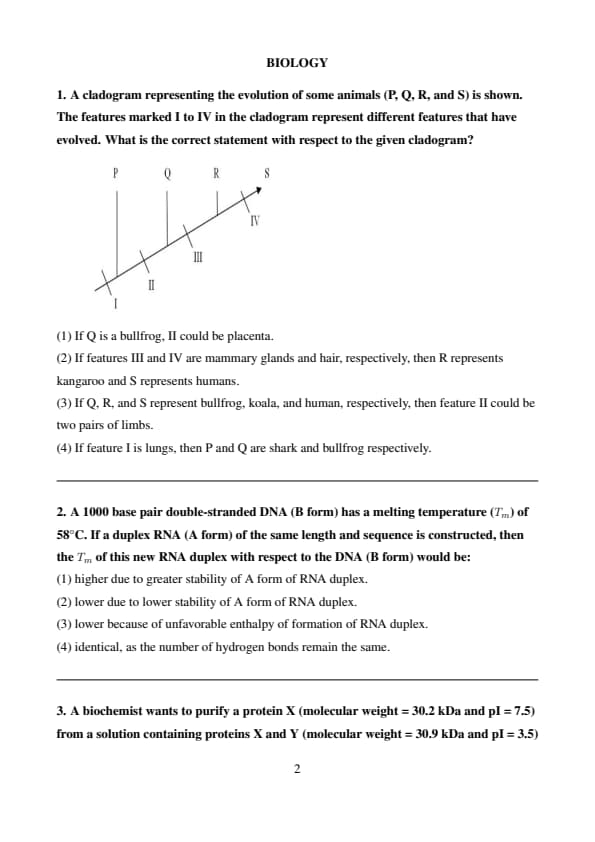 Therefore, the correct option is (3), since Q (bullfrog), R (koala), and S (human) all share this trait, which would be two pairs of limbs, making feature II a key trait for that evolutionary stage. Quick Tip: In cladograms, use the branching points to identify when new features evolved, and consider how shared traits help in the classification of animals.