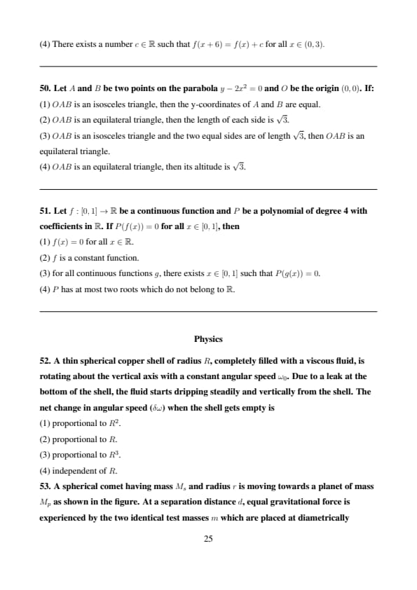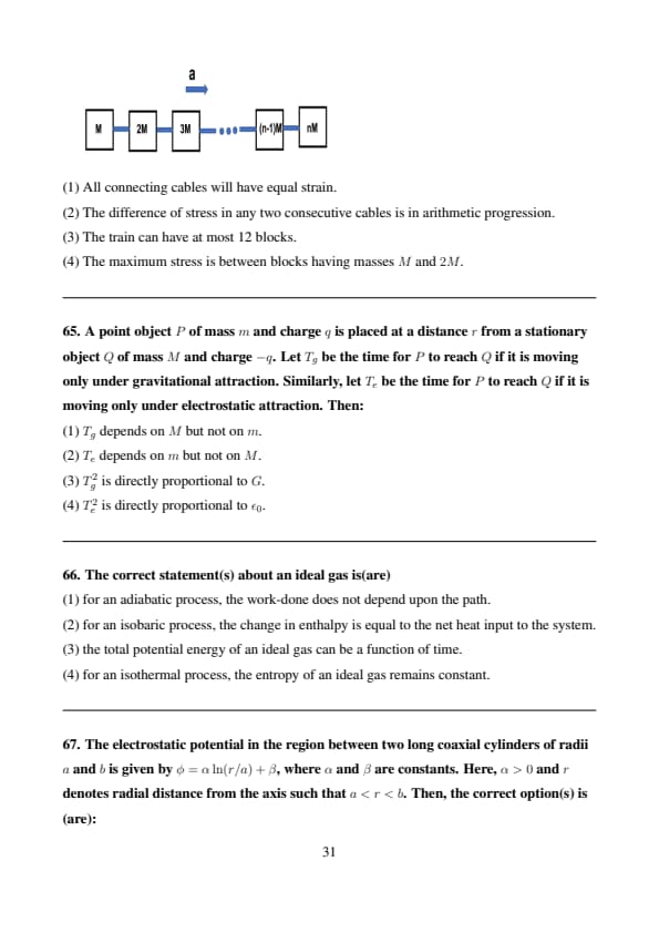 Electrostatic Force: The electrostatic force is independent of the moving object's mass and depends on the charges and the distance between them. Thus, the time for the moving object to reach the stationary object is dependent on its mass. Quick Tip: In problems involving gravitational and electrostatic attraction, remember that the time for an object to reach another object under gravitational attraction depends on the mass of the stationary object \( M \), while under electrostatic attraction, it depends on the mass of the moving object \( m \) and the permittivity of free space \( \epsilon_0 \).