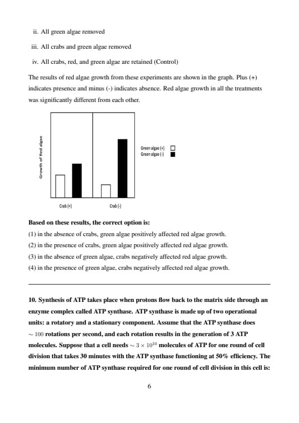 In a closed ecosystem, red algae, crabs, and green algae interact with each other. The following experimental treatments were imposed: