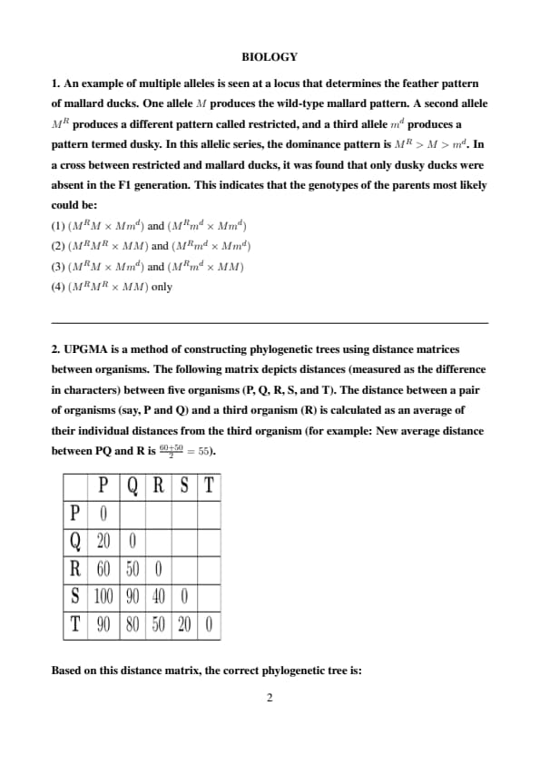 The correct answer is \( (M^R M \times M m^d) \) and \( (M^R m^d \times M M) \). Quick Tip: When dealing with multiple alleles and dominance patterns: - Always identify the dominance hierarchy (e.g., \(M^R > M > m^d\)) and consider the genotypes of the parents. - Recessive traits (like \(m^d\)) require both alleles to be inherited to express the phenotype. - Crosses that exclude certain genotypes in the F1 generation provide clues about the parents' genotypes.