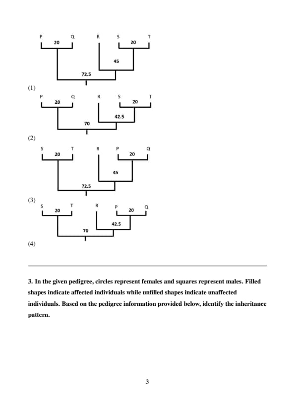 \[ Autosomal recessive. \] Quick Tip: In pedigrees, if the trait skips generations and both males and females are affected, it is likely autosomal recessive. For autosomal dominant traits, the affected individuals usually have at least one affected parent. In X-linked inheritance, males are typically more affected than females, and the pattern of inheritance for males and females is different.