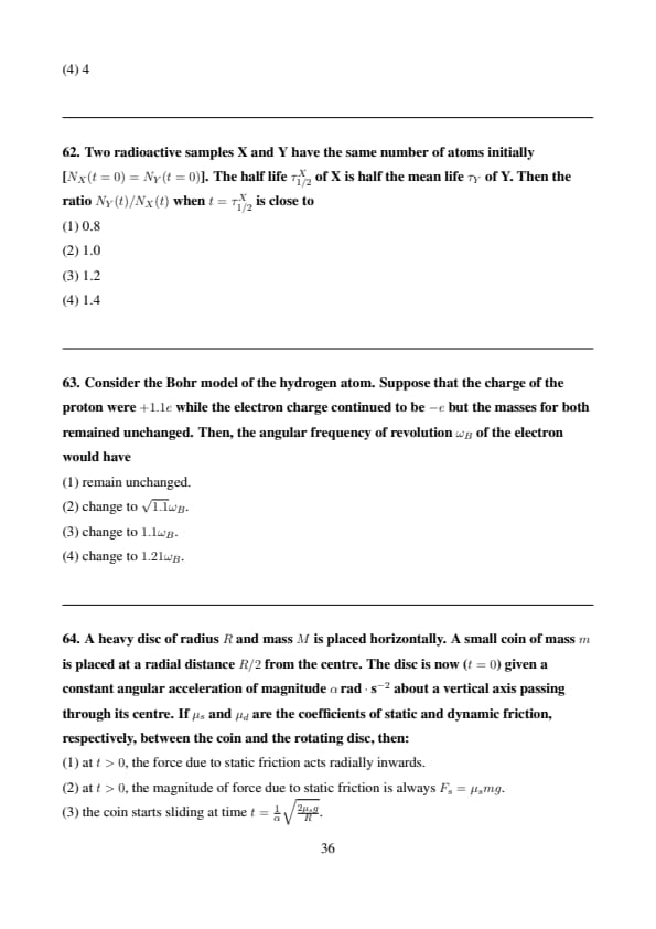 Correct Answer: The angular frequency would change to \( 1.21 \omega_B \). Quick Tip: In the Bohr model, both the force balance and the angular momentum quantization condition determine the properties of the electron's orbit. The angular frequency depends on the charges of the proton and electron. Remember to consider how the change in proton charge affects the radius of the orbit through the quantization condition.