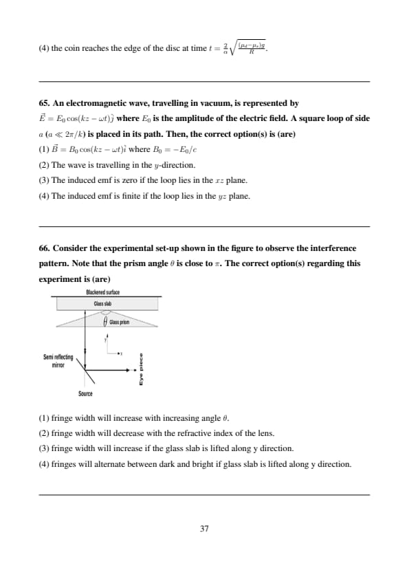 Option (4) assumes a net tangential acceleration with kinetic friction and predicts reaching the disc's edge — however, this formula is not derived correctly from equations of motion under kinetic friction, and it's contextually flawed. Hence, (4) is incorrect. Quick Tip: In rotational motion with friction, always equate required centripetal force with the available frictional force to find limits of static friction. The direction of static friction is always toward the center (centripetal).