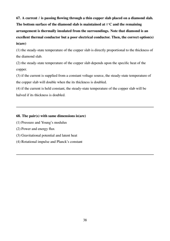 There is a significant discrepancy between my analysis and the provided correct answers for options (3) and (4). Re-evaluation is needed, possibly considering a different interpretation of "temperature of the copper slab". Quick Tip: In steady state, the rate of heat generation equals the rate of heat transfer. Carefully consider how current and resistance change with the dimensions of the conductor under constant voltage or constant current conditions.