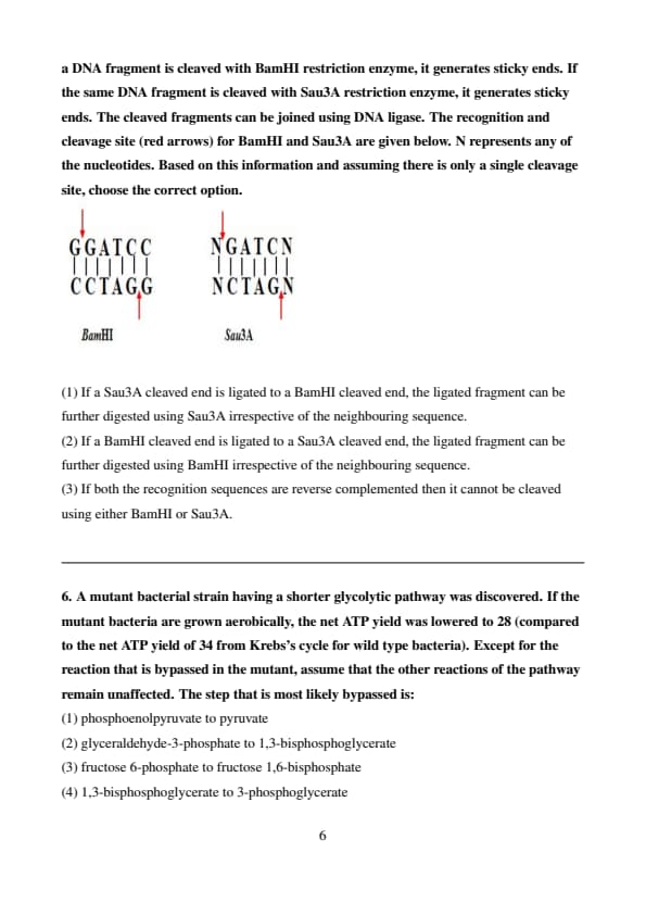 Restriction enzymes recognize certain sequences within the DNA and cleave them. If a DNA fragment is cleaved with BamHI restriction enzyme, it generates sticky ends. If the same DNA fragment is cleaved with Sau3A restriction enzyme, it generates sticky ends. The cleaved fragments can be joined using DNA ligase. The recognition and cleavage site (red arrows) for BamHI and Sau3A are given below. N represents any of the nucleotides. Based on this information and assuming there is only a single cleavage site, choose the correct option.
